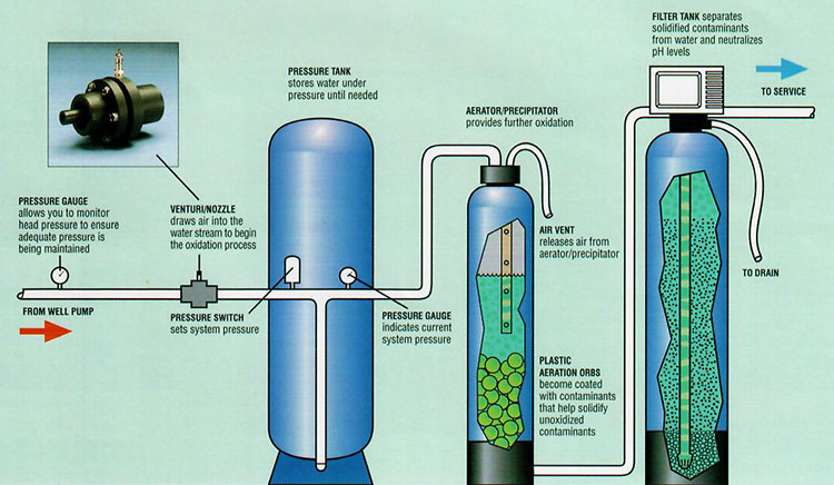 The Venturi/Nozzle, placed in the line between the pressure gauge amd the pressure tank, is where the process of removing unwanted elements begins. As the water is forced through the Venturi/Nozzle under pressure, a vacuum is created that draws air into the water line. This air and water are mixed, thus starting the oxidation process that converts “dissolved solids” into “suspended solids” that can be filtered out of the water.